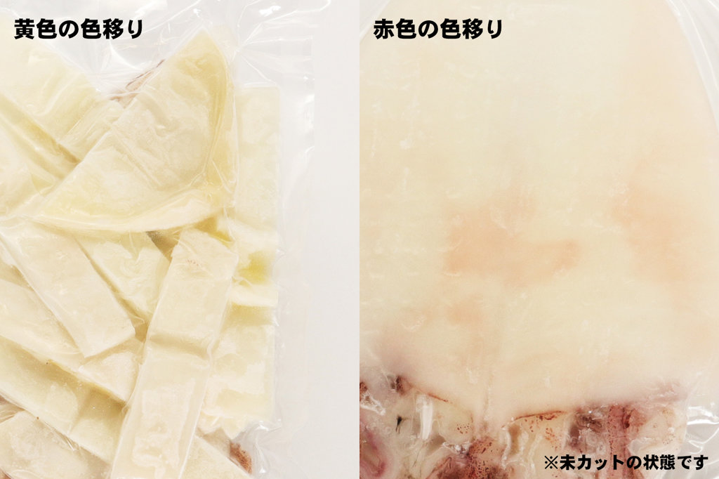 赤色:冷凍されたイカを解凍した際に、皮の赤い色が身に染み移ってしまったもの