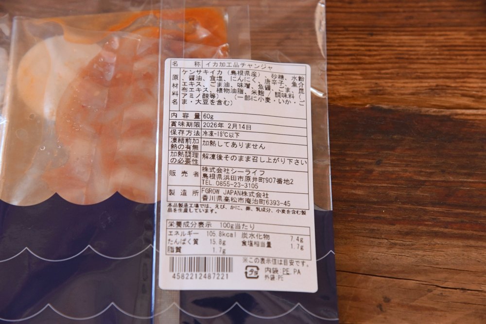 | 原材料名 | 【イカ加工品チャンジャ】ケンサキイカ(島根県産)、砂糖、水飴、醤油、食塩、にんにく、唐辛子、魚介エキス、ごま油、味噌、魚醤、ごま、昆布エキス、植物油脂、米麹/調味料(アミノ酸等)、(一部に小麦・いか・ごま・大豆を含む) |